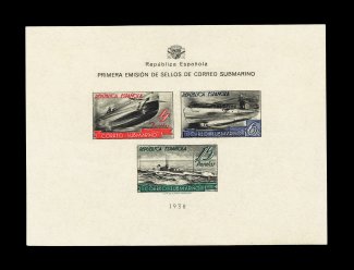 2531 nh Mi Block 5 imageMichel Block #5, 1938 Submarine souvenir sheet of three, imperforate, an immaculate example of this very scarce souvenir sheet, without any of the wrinkles or other flaws that plague these sheets, wonderfully fresh colors, pristine o.g., never hinged, extremely fine; a sheet for the collector who demands perfection. (Image) Michel Euro €2,500
