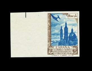 2536 nh B109-122 vars. image#B109-22 vars., CB8-17 vars., EB2 var., 1940 10c+5c to 10P+4P Virgin of the Pillar, imperforate cplt. including the air post and special delivery stamps, all are sheet-margin examples, wonderfully fresh, o.g., n.h. (small spot on gum of 45c), extremely fine and choice set (Michel #859U-883U; €1,000). (Image) for hinged 675.00