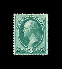 1180 og 169 image#169, 3c Blue green special printing, without gum as issued, an extraordinarily well centered and margined example of this important special printing rarity, being not only far better centered and margined than normally found, but this is also among the few existing examples whose perforations are essentially intact despite having been scissor separated as customary, deep luxuriant color, mild overall toning, otherwise extremely fine for this value; only approximately 35 to 40 Three Cent Hard Paper Special Printings are thought to still exist. (Image) 15,000.00