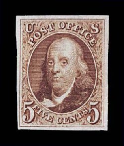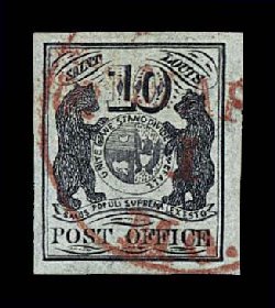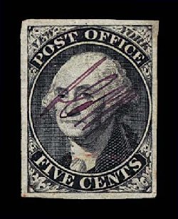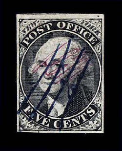 3 O 9X1b image#9X1b, New York, N.Y. 5c Black Postmaster Provisional, signed A.C.M., a visually striking used example, featuring large margins virtually all around, deep rich color and impression, and beautifully postmarked with gorgeous multiple strikes of a red "PAID" cancel, extremely fine; 1994 PF certificate. (Image) $750.00