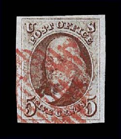 9 O 1 image#1, 5c Red brown, used, very light strike of a blue postmark, four mostly large margins, attractive rich color and a particularly detailed impression on bright paper, choice very fine. (Image) $585.00