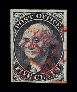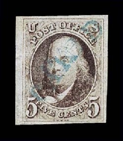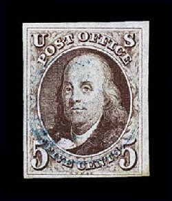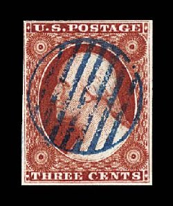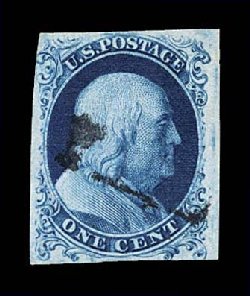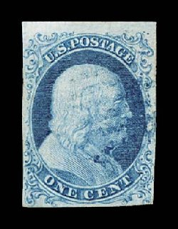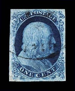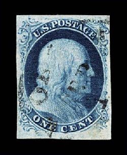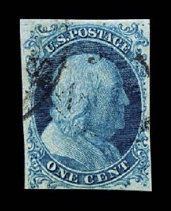 14 O 5 image#5, 1c Blue, Ty. I, position 7R1E, full to exceptionally large margins virtually all around, including a partial sheet margin at top, margin at bottom right barely touching plume, being among the very few existing examples whose design is virtually intact all around, wonderfully fresh and distinctive early Plate 1 color, unusually lightly cancelled with a blue grid postmark (one of just a few recorded with any type of colored cancel), the cancel is well placed leaving the important Type I design characteristics completely unobscured, there is a small mild corner crease at top left, which is entirely in the partial sheet margin and well away from the design, very fine overall.An incredibly choice example of one of the rarest and most sought-after classic United States stamps. One position, the legendary position 7R1E, provides the philatelic world with the only full Type I design as originally intended, a characteristic no other One Cent imperforate displays. According to the masterwork, The Wagshal Census of 7R1E by Jerome S. Wagshal, there are only 90 confirmed examples of the imperforate Type I, the vast majority of which are used. When one eliminates those found on cover or in multiples, there are a mere 56 single examples available to collectors. Of this population very few are found with the overall eye-appealing characteristics this stamp possesses - most particularly its wide margins displaying a virtually intact design - plus bearing a seldom seen colored cancellation. In our opinion, the copy offered here from the McCree collection ranks among the finer copies available of this important rarity. Accompanied by a 1995 PF certificate. (Image) $45,000.00