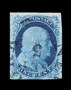 15 O 5A image#5A, 1c Blue, Ty. Ib, position 9R1E, a particularly handsome and seldom seen sound example of this rare type that only comes from the top row of plate 1, with ample to large margins all around, just barely touching design at bottom left, exceptional powder blue shade that is characteristic on the early state of this plate, and set on fresh white paper, well defined impression showing the Ty. Ib design characteristics well, light unobtrusive strike of a black town c.d.s., very fine for this; 1995 PF certificate. (Image) $7,000.00