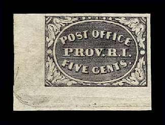 4 nh 10X1 image#10X1, Providence, R.I. 5c Gray black Postmaster Provisional, handsome bottom left corner sheet-margin mint single, large to huge margins all around, quite fresh, o.g., stamp never hinged (hinged in left sheet selvage only), light horizontal crease in bottom sheet selvage which could easily be trimmed off and still leave a sizable portion of the sheet selvage, extremely fine; 1997 PF certificate. (Image) for hinged $350.00