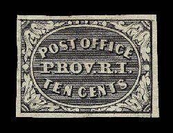5 ng 10X2 image#10X2, Providence, R.I., 10c Gray black Postmaster Provisional, unused, four large and very well balanced margins, strong color and impression, extremely fine; 1997 PF certificate. (Image) $1,100.00