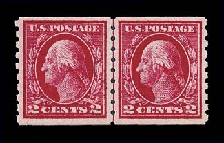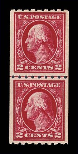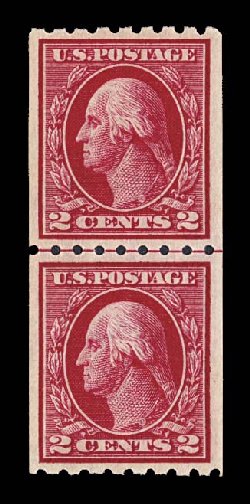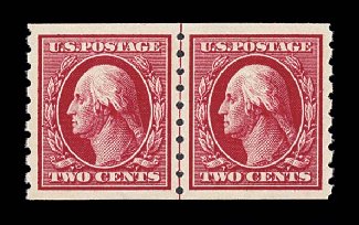 358 nh 413 image#413, 2c Carmine coil, Ty. I, perf. 8 1/2 vert., pristine guide line pair, marvelously fresh and crisp, intense "fiery" color and impression, excellent centering within large margins, o.g., n.h., trivial natural inclusion speck in the right stamp, extremely fine; 1990 PF certificate. (Image) $625.00