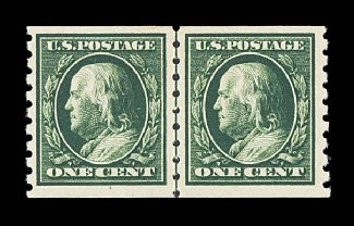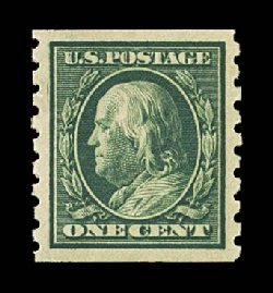 342 nh 392 image#392, 1c Green coil, perf. 8 1/2 vert., gem mint single, precisely centered amid exceptionally large margins, sumptuously rich color and a deeply etched impression on pristine paper, o.g., n.h., extremely fine; photocopy of a 1995 PF for a pair, this being the right stamp. (Image) $55.00