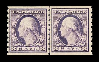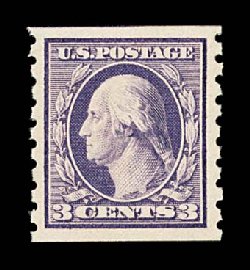 346 nh 394 image#394, 3c Deep violet coil, perf. 8 1/2 vert., gem mint single, incredibly well centered amid extravagantly large margins, strong rich color and impression on bright paper, o.g., n.h., extremely fine; certified singles of this coil are seldom seen this choice; 1989 PSE certificate. (Image) $125.00