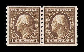 348 og 395 image#395, 4c Brown coil, perf. 8 1/2 vert., guide line pair, exceedingly well centered within very large margins, perfectly positioned guide line between the two stamps, gloriously rich color and a deeply etched impression, o.g., l.h., extremely fine; a particularly choice example of this coil line pair; 1996 PSE certificate. (Image) $425.00