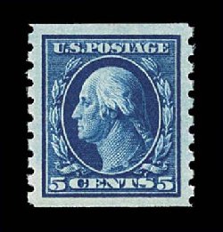349 nh 396 image#396, 5c Blue coil, perf. 8 1/2 vert., a spectacular quality mint single, featuring absolutely perfect centering amid enormously large margins which are most uncommon, strikingly intense color in a deep shade, plus its perforations on both sides are completely intact (a seldom seen occurrence on perf. 8 1/2 coils), immaculate o.g., n.h., extremely fine; a superb gem for the most fastidious collector; 2001 PF certificate. (Image) $125.00