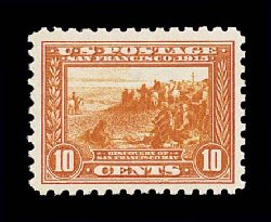 355 nh 404 image#404, 10c Panama-Pacific, perf. 10, a wonderfully fresh and choice mint example of this scarce commemorative stamp, possessing an outstanding overall brilliance, with gorgeous intense color and impression on immaculate paper, well centered, fully intact perforations all around, pristine o.g., never hinged, tiny natural inclusion speck seen only on reverse and not even mentioned on accompanying certificate, extremely fine; 1997 PF certificate. (Image) $1,900.00