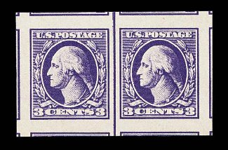 425 nh 535 image#535, 3c Violet offset imperforate, Ty. IV, the "ultimate" mint horizontal pair of this value, having been cut from a sheet so that equal portions of all ten adjoining stamps appear, creating a gigantic jumbo-margined pair, deep luxuriant color on bright fresh paper, immaculate o.g., n.h., a superb pair for the collector who seeks out only stamps in the most spectacular condition possible. (Image) $40.00