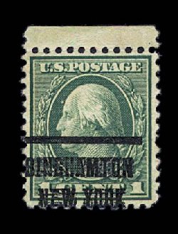 427 O 544 image#544, 1c Green coil waste, perf. 11, a handsome used example of this rare and notoriously difficult stamp, being a top sheet-margin copy that is quite well centered within uncharacteristically large margins, rich color and a clean impression, neat "Binghamton/New York" precancel, small crease in the top selvage which just barely extends into the top right corner, however at this point it is quite faint and of little consequence, otherwise very fine for this; it is believed that less than 100 used examples exist; 1990 PF certificate. (Image) for fine $3,250.00