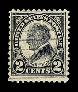 436 O 613 image#613, 2c Harding, rotary press perforated 11, exceptionally well centered for this, particularly when compared to other existing examples, with its perforations well clear of the design all around (a rare occurrence), strong rich color and an unusually clean impression on bright paper, very light and unobtrusive machine postmark, small corner crease at bottom right that certainly does not affect this stamp's exceptional very fine appearance.The Two Cent Harding rotary press perforated 11 stamp is one of the most sought-after rarities in United States philately. There are 39 confirmed singles and two pairs known - all of which are used. More than half of the existing population are found with its perforations touching or cutting the design. The example offered here from Mr. McCree's collection is among the better centered examples available, and certainly one of the most lightly cancelled. A highly desirable and eye-appealing example of this important rarity. Accompanied by a 1993 PF certificate. (Image) for fine $42,500.00