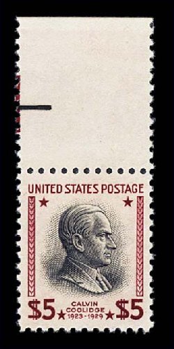 440 nh 834a image#834a, $5.00 Red brown and black error of color, a magnificent quality mint example of this rare and popular color error, being a pristine top sheet-margin copy, possessing absolutely perfect centering within lavishly large margins, strikingly intense and unmistakable error color, unblemished o.g. without any of the usual gum bends or skips, n.h., an extremely fine gem in every regard; signed in pencil by George B. Sloane on the reverse of the top sheet selvage and accompanied by a 1999 PF certificate. (Image) $3,000.00