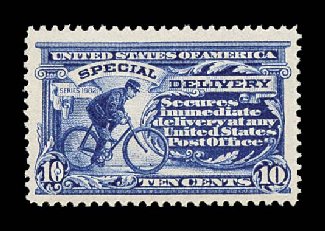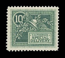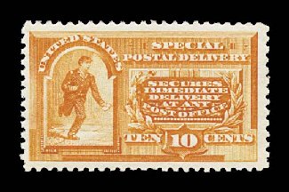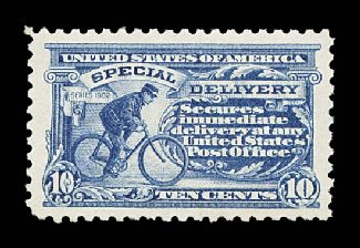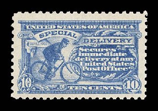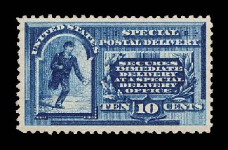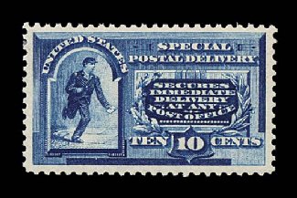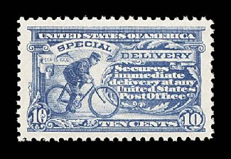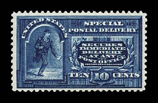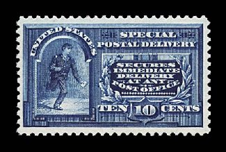 449 nh E4 image#E4, 10c Blue, a true gem single of this key special delivery, being in a quality that is next to impossible to find on this particular stamp, magnificently well centered amid lavishly large margins that are seldom encountered on this issue, even this stamp's color is far more intense and its impression more detailed than usual, and perhaps most significant is that it has retained flawless original gum that has never been hinged putting this stamp into the category of the truly rare, extremely fine; certainly among the finest never hinged examples available; 1988 PF certificate. (Image) $1,750.00