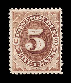 458 og J4 image#J4, 5c Brown, well centered, fresh and crisp, with strong bright color and a deep impression, full o.g., lightly hinged, choice very fine; 1997 PF certificate. (Image) $700.00