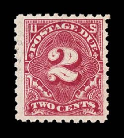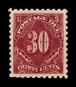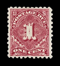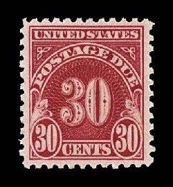 501 nh J57 image#J57, 30c Carmine lake, a fabulous quality single, boasting absolutely perfect centering amid huge margins, its color is incredibly deep and luxuriant, while its impression is deeply etched, pristine o.g., never hinged, extremely fine; a most remarkable quality postage due; 2001 PF certificate; ex-"Piedmont" Collection. (Image) $500.00