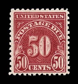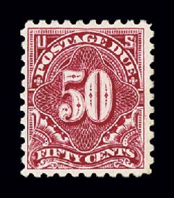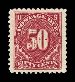 502 og J58 image#J58, 50c Carmine lake, an attractive and choice mint example of this, the rarest of all the regularly issued postage dues and one of the rarest stamps in United States philately, possessing a marvelous overall freshness not often encountered on most existing examples, with gorgeous vibrant color and a razor-sharp impression on bright paper, while centered just a bit to left, this is actually far better centered than most, as this stamp is notorious for being found poorly centered, often with its perforations cutting the design, full clean o.g., lightly hinged, very fine; a stamp which makes infrequent appearances on the auction market; 1979 and 1995 PF certificates. (Image) $15,000.00
