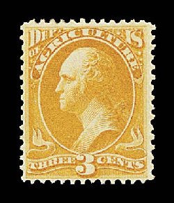 512 og O3 image#O3, 3c Agriculture, crisp mint example, well centered, radiant yellow color, full fresh o.g., lightly hinged, very fine and choice; 2001 PF certificate. (Image) $175.00