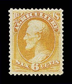 513 og O4 image#O4, 6c Agriculture, an incredibly choice mint example, beautifully centered within considerably larger margins than usual, brilliant yellow color, full clean o.g., lightly hinged, extremely fine; quite scarce thus; 1991 PF certificate (erroneously identifying it as #O6). (Image) $180.00