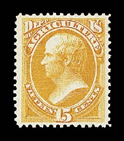 516 og O7 image#O7, 15c Agriculture, an impressive mint example, featuring exceptional centering within uncharacteristically wide and well balanced margins, especially deep luxuriant color, full clean o.g., very lightly hinged, extremely fine and quite desirable thus; 1990 PF certificate. (Image) $350.00