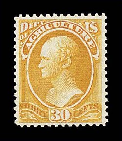 518 og O9 image#O9, 30c Agriculture, highly select mint example of this scarce and difficult value, marvelously well centered within large margins, surrounded by crisp even perforations, lovely vibrant color, plus full clean o.g. with only the lightest of hinging, extremely fine; an unusually choice stamp; 2000 PF certificate. (Image) $450.00