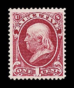 519 og O10 image#O10, 1c Executive, a most impressive mint example of this scarce and difficult value, brilliantly fresh, with sumptuously rich color, but even more impressive is this stamp's exceptional centering amid lavishly large margins which are seldom associated with this value, full o.g. that has been relatively lightly hinged, extremely fine; 1994 PF certificate. (Image) $800.00