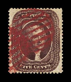41 O 30A image#30A, 5c Brown, Ty. II, an absolutely gorgeous used example which possesses exceptional eye-appealing qualities, being flawlessly centered within large margins, its color is extraordinarily intense and its impression well etched, all wonderfully complemented by striking multiple strikes of vivid red grid postmarks, an extremely fine used gem in every regard; 1998 PF certificate. (Image) $320.00