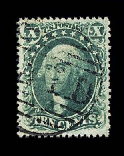 45 O 35 image#35, 10c Green, Ty. V, used, precisely centered amid huge jumbo margins, bright fresh color and impression, couple strikes of attractive blue town c.d.s., extremely fine used gem; photocopy of a 1999 PF certificate for a horizontal pair, this being the right stamp. (Image) $70.00