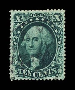 42 O 31 image#31, 10c Green, Ty. I, handsome used example that is so lightly cancelled that at first glance it appears unused, exceptionally well centered amid much larger margins than normally seen on this scarce type, especially intense color in a deep "sage" green shade, plus its impression is quite detailed on bright paper, very fine and choice; 1993 PSE certificate. (Image) $1,200.00