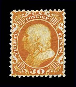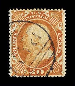 50 O 38 image#38, 30c Orange, a superlative used example which boasts outstanding physical attributes seldom associated with this stamp, including being flawlessly centered amid uncharacteristically large margins, its color is extraordinarily intense and vibrant, completely unaffected by oxidization, wonderfully postmarked with a light strike of a scarce large Boston "Paid" in grid, an extremely fine used gem; 1992 PF certificate. (Image) $485.00