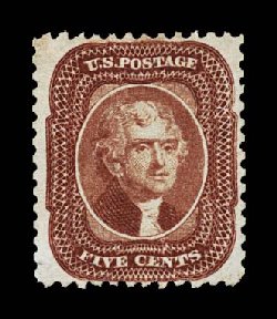 54 og 42 image#42, 5c Orange brown reprint, without gum as issued, exceedingly well centered and margined for this particular value, rich luxuriant color and a crisp impression on bright paper, extremely fine for this; only 878 issued; 1994 PF certificate. (Image) $1,400.00
