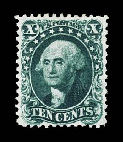 55 og 43 image#43, 10c Blue green reprint, without gum as issued, an incredibly handsome and choice example of this always difficult value, featuring an extraordinary overall freshness and brilliance not often seen, with strikingly intense color and a prooflike impression on immaculate paper, marvelously centered as well, with large margins, fully intact perforations all around, extremely fine; certainly among the finest available of the 516 issued; 1994 PF certificate. (Image) $3,000.00