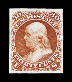 58 og 46 image#46, 30c Yellow orange reprint, without gum as issued, a highly select and desirable quality example of this rare and difficult reprint, possessing mathematically precise centering that is almost unheard of, as the great majority of this value are found more poorly centered than any other from this Reprint series, gloriously rich and vibrant color that must be seen in person to fully appreciate, strong impression on bright paper, extremely fine; among the finest of the 480 issued; the perfect stamp for the collector who is patiently and meticulously assembling a truly exceptional set of 1875 Reprints; 1972 and 1989 PF certificates. (Image) $3,250.00