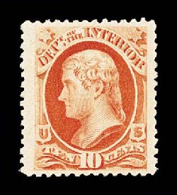 581 nh O100 image#O100, 10c Interior, on soft porous paper, a gorgeous jumbo mint single in the finest quality possible, precisely centered amid extra-large to huge margins at sides, brilliantly fresh color and paper, unblemished o.g., never hinged, extremely fine gem; 1999 PF certificate. (Image) for hinged $100.00