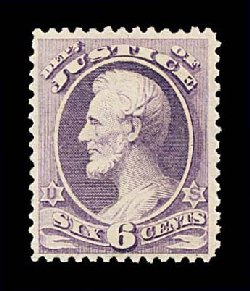 585 og O107 image#O107, 6c Justice, on soft porous paper, choice mint example of this scarcer stamp, quite well centered, fresh color, full clean o.g., lightly hinged, very fine and a far more elusive stamp than its catalog value implies; 1992 PF certificate; ex-"Chappaqua" Collection. (Image) $300.00