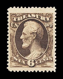586 og O110 image#O110, 6c Treasury, on soft porous paper, a spectacular jumbo-margined mint single, possessing incredibly large margins at top and bottom and unusually large margins at sides as well, plus precisely centered within these lavish borders, unusually deep color and a clean prooflike impression, full fresh o.g., faint trace of hinging, extremely fine and most impressive; 2003 PF certificate. (Image) $110.00
