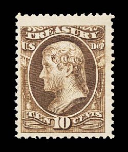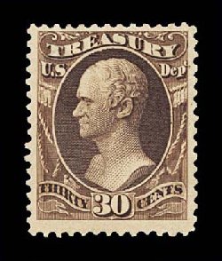 588 og O112 image#O112, 30c Treasury, on soft porous paper, a particularly fresh and attractive mint example of this very scarce and always difficult stamp, with considerably deeper color than typically found, bright paper, well centered, full o.g., lightly hinged, very fine and choice; a most elusive stamp to find both sound and still retaining its original gum; 2002 PF certificate. (Image) $1,750.00