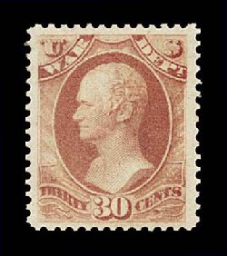 589 og O120 image#O120, 30c War, on soft porous paper, precisely centered, extravagantly large margins, fresh color, o.g., very lightly hinged, extremely fine. (Image) $130.00