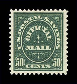 590 nh O122 image#O122, 50c Postal Savings, pristine mint single, exceptionally well centered within large to extra-large margins, intense deep green color and a prooflike impression, flawless o.g., n.h., extremely fine. (Image) $275.00