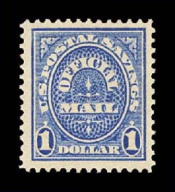 591 nh O123 image#O123, $1.00 Postal Savings, striking pristine mint single of this high value postal savings official that is surprisingly difficult to acquire in gem condition, this example is wonderfully well centered with huge lavish margins, bright color and a detailed impression, flawless pristine o.g. that has never been hinged, extremely fine and incredibly choice; 1997 PF certificate. (Image) $300.00