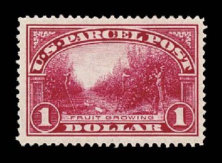 594 og/nh Q1-12 image#Q1-12, 1c-$1.00 Parcel Post cplt., fresh mint set, several exceptionally well centered and large examples are present including the 5c, 10c and the $1.00, all have clean o.g., all values through the 50c are never hinged, the 75c and $1.00 being very lightly hinged, fine-very fine or better; PF certificates for the 4c, 5c, 10c and 50c values. (Image) $2,220.50