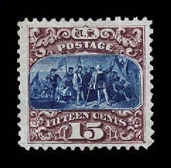 144 ng 129 image#129, 15c Brown and blue re-issue, Ty. III, striking unused example, possessing margins of exceptional size and being wonderfully well centered amid them, prooflike colors and impressions on bright fresh paper, extremely fine; few of the 1,981 issued of this value are found with such impressive margins; 1988 PF certificate. (Image) $1,050.00