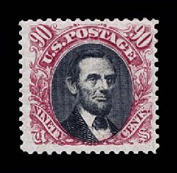 147 og 132 image#132, 90c Carmine and black re-issue, an exceptionally fresh and choice mint example of this popular re-issue rarity, possessing a marvelous overall brilliance, with intensely rich colors and razor-sharp impressions on crisp paper, well centered, full o.g., relatively lightly hinged, very fine; only 1,356 issued; 1991 PF certificate. (Image) $4,850.00