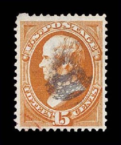 155 O 141 image#141, 15c Orange with grill, fresh used example of this scarce grilled value, unusually well centered amid large margins, strong vivid color and sharp impression, light centrally struck black cancel, plus a small portion of a red c.d.s. at bottom left, several rows of the grill are easily evident, extremely fine; 1984 PF certificate. (Image) $1,290.00