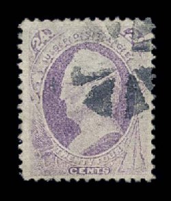 156 O 142 image#142, 24c Purple with grill, a choice and highly desirable used example of this rare and notoriously difficult Bank Note, the majority of which are found off center and/or faulty, this particular copy however is not only fault-free, but possesses exceptional physical attributes that are not normally associated with this value, including being wonderfully well centered within large margins, its color is stronger and richer than usual, with a rather attractive black petite rosette cancel, in addition it has a virtually full and easily discernable grill impression which is almost never found on this stamp, certainly an extremely fine example of a stamp that is missing from most collections; 1998 PF certificate. (Image) $6,500.00