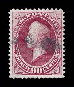 158 O 144 image#144, 90c Carmine with grill, precisely centered used example of this very scarce grilled value, full balanced margins, attractive with unusually strong color and crisp impression, light black cancel, grill is actually quite strong and easily identifiable, extremely fine; a difficult stamp to find in such choice used condition; 1989 PF certificate. (Image) $2,000.00