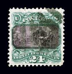 219 O 130 image#130, 24c Green and violet re-issue, an exceptionally choice used example of this value which, despite the difference in catalog value, is far more elusive to find used than mint, wonderfully well centered within large margins, extraordinarily strong rich colors, central black registry oval pmk., extremely fine; it is estimated that only 50-75 of the 2,091 issued of this value were ever used, and few of these are found in the premium quality this stamp possesses; 1998 PF certificate; ex-"Ganymede". (Image) $1,600.00