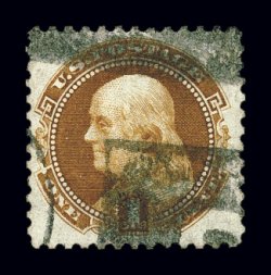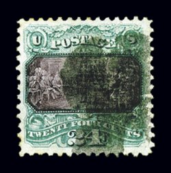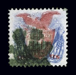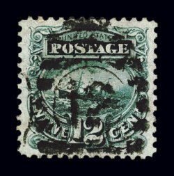 216 O 128 image#128, 12c Green re-issue an extraordinarily handsome used example of a stamp that is the second rarest value from the 1869 Pictorial re-issue series to find used (the 3c is, of course, the rarest), marvelously well centered, with unusually large margins all around, rich luxuriant color and a razor-sharp impression, attractively cancelled by numeral "12" in oval of bars portion of a duplex postmark, small light corner creases at top, otherwise extremely fine; only 1,584 stamps of the Twelve Cent Re-issue were issued and it is estimated that only 15-25 examples exist used, furthermore the vast majority have faults, this particular copy is by far one of the nicest and most attractive available; 1970 and 1999 PF certificates; ex-Zoellner, "Ganymede". (Image) $3,000.00